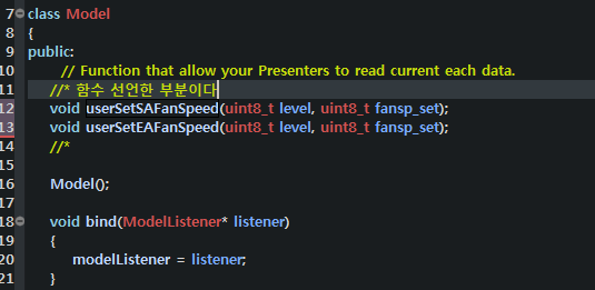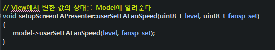 해당 화면의 Presenter.cpp에 model에 전달할 함수를 작성하여 줍니다.