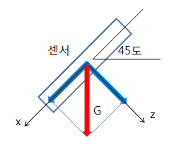 하지만 간단한 만큼 문제점이 있습니다. 정지된 상태에서 물체가 움직이기 시작하면 그때 측정되는 값은 기울기를 나타내지 않을 수 있습니다. 예를 들어 45도 기울어진 위와 같은 상태에서 오른쪽으로 가속을 해본다고 가정해 보죠. 그러면 x축과 z축에서 측정되는 가속도는 변하게 됩니다. 한쪽값이 더 커지겠죠? 그러면 이 상태에서 atan 에 대입한다고 하더라도 45도 값은 나오지 않게 됩니다. 즉 움직임이 생겨서 어느 한쪽 방향으로 가속도가 생기게 되면 결과적으로 이 값이 중력에 의해 측정되는 가속도값과 구분이 안되게 됩니다.
