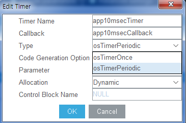 주의할 점은 Code Generation Option에서 한번만 수행하는 타이머(osTimerOnce) 인지 주기적으로 수행되는 타이머인지 선택하는 것이다