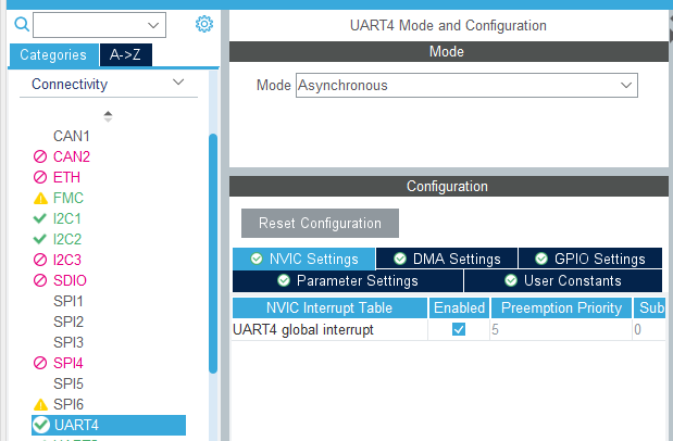 uart4의 NVIC Setting에서 global interrupt의 enable을 클릭하여 인터럽트를 활성화시킨다