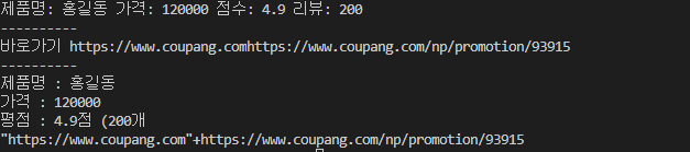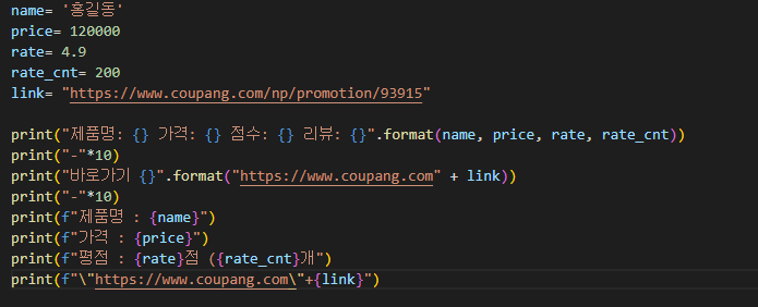 print("바로가기 {}".format("https://www.coupang.com" + link)) 의 형식은