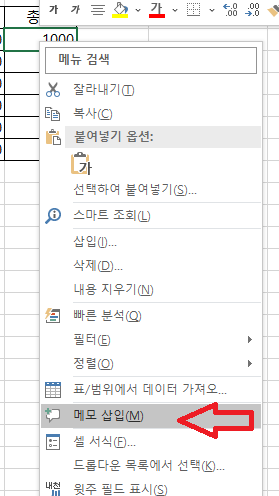 메모를 삽입하고 싶은 셀에서 마우스 오른쪽을 클릭합니다.