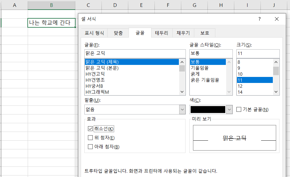 글꼴 메뉴에 있는 취소선을 체크하고 확인을 누릅니다.
