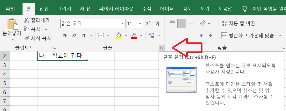 원하는 셀을 선택한 후에 화살표로 표시된 부분을 누릅니다.